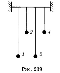 1728. На рисунке 239 изображены четыре маятника одинаковой массы на закрепленной железной спице. Если толкнуть первый маятник, в каком возможен резонанс? 1729. Как можно добиться максимального отклонения маятника, прилагая минимальную силу? 1730. Найдите длину математического маятника, период колебания которого на широте Москвы равен 1 с (g = 9,81 м/с2). 1731. Чему должно быть равно ускорение силы тяжести, чтобы маятник длиной 1 м колебался с периодом в 2 с? 1732. Определите длину маятника с периодом колебаний 1 с, если он находится: а) на Луне (gЛ = 160 см/с2);