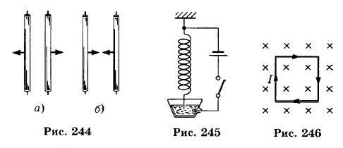 1773. Взаимодействуют ли два провода троллейбусной линии? Если да, то как именно? 1774. На рисунке 244 показано, как взаимодействуют проводники с током. Покажите стрелками направления токов в проводниках. 1775*. Струя расплавленного алюминия при пропускании по ней тока сужается. Чем объяснить это явление? 1776. На рисунке 245 изображена электрическая цепь с проводником в форме пружины. Нижний конец пружины погружен в ртуть. Что происходит с пружиной в электрической цепи после замыкания ключа? Как при этом изменяется сила тока в цепи? 1777. Какое действие оказывает однородное магнитное поле на рамку с током (рис. 246)? Как магнитное поле действует на каждую сторону рамки? Что нужно сделать, чтобы магнитное поле сжимало рамку?