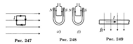 1778. Как будет поворачиваться рамка с током в однородном магнитном поле (рис. 247)? Как магнитное поле действует на каждую сторону рамки? Что нужно сделать, чтобы рамка повернулась в противоположную сторону? 1779. ка с током подвешена между полюсами магнита. Направление тока в ней указано стрелками (рис. 248). Как будет двигаться рамка в случае а ив случае б? Как магнитное поле действует на каждую сторону рамки в случае а? в случае б? 1780. Если рукой остановить лопасть работающего настольного вентилятора, его корпус начинает нагреваться. Почему? 1781. На рисунке 249 изображен провод длиной 50 см в однородном магнитном поле с индукцией 0,4 Тл. Провод расположен перпендикулярно линиям магнитной индукции, и по нему течет ток силой 0,5 А. Найдите модуль и направление силы, действующей на проводник.