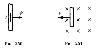 1782. Двухметровый прямолинейный проводник, по которому течет ток силой 0,4 А, находится в однородном магнитном поле. На проводник со стороны поля действует сила, по модулю равная 0,4 Н (рис. 250), а вектор индукции магнитного поля перпендикулярен проводнику. Найдите модуль и направление вектора индукции магнитного поля. 1783. На прямолинейный проводник длиной 80 см, помещенный в однородное магнитное поле, со стороны магнитного поля действует сила, равная 0,2 Н (рис. 251). Определите силу тока и направление тока в проводнике, если индукция магнитного поля равна 0,04 Тл.