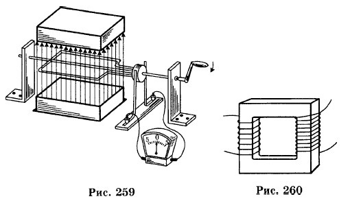 1811. Сколько витков должна иметь вторичная обмотка понижающего трансформатора (рис. 260), первичная обмотка которого имеет 1200 витков, если напряжение должно быть понижено от 120 В до 4 В? 1812. Первичная обмотка трансформатора, включенная в сеть 110 В, имеет 550 витков. Какое число витков должна иметь вторичная обмотка, если необходимо получить 440 В? 1813. Катушки трансформатора имеют: первичная — 1200 витков, вторичная — 6000 витков. Какое напряжение получим на клеммах вторичной обмотки, если на клеммы первичной подаем напряжение 80 В? 1814. Каково должно быть напряжение для передачи мощности в 1000 кВт током в 100 А? 1815. Почему при передаче электрической энергии на большие расстояния экономнее пользоваться током высокого напряжения? 1816. Мощность в 500 кВт передают при помощи трансформатора, причем после трансформатора идет ток уже 50 А. Рассчитать, каково напряжение на клеммах первичной и вторичной обмоток (при отсутствии потерь), если отношение числа витков первичной и вторичной обмоток 1:100. 1817. Изменится ли соотношение между напряжениями на зажимах первичной и вторичной обмоток трансформатора, если железный сердечник вынуть или если вместо него вставить медный? 1818. Что изменится в трансформаторе, если его железный сердечник заменить алюминиевым? 1819. Трансформатор, коэффициент полезного действия которого 96%, используется для передачи энергии мощностью в 25 кВт с генератора, напряжение на зажимах которого 500 В. Сколько киловатт будет действительно передано по линии, если число витков в первичной и вторичной обмотках 500 и 1000 соответственно, а сопротивление линии 3 Ом? 1820. Первичная обмотка трансформатора имеет 500 витков, а вторичная — 5000. Напряжение на первичной обмотке — 220 В. Каково будет напряжение на вторичной? Какова будет сила тока в первичной и вторичной обмотках трансформатора, если по линии передавать энергию мощностью в 11 кВт?