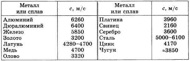 Скорость с звука металлах и сплавах (при t = 20 °С)