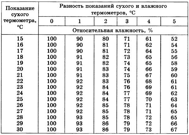 Пример. Сухой термометр показывает 22 °С, влажный -19 °С. Разность показаний термометров 3 °С. Значение относительной влажности (в процентах) находят на пересечении строки, начинающейся числом 22, и столбца, в головке которого стоит число 3, т.е. относительная влажность равна 76%. Удельная теплоемкость расплавленных металлов и сжиженных газов