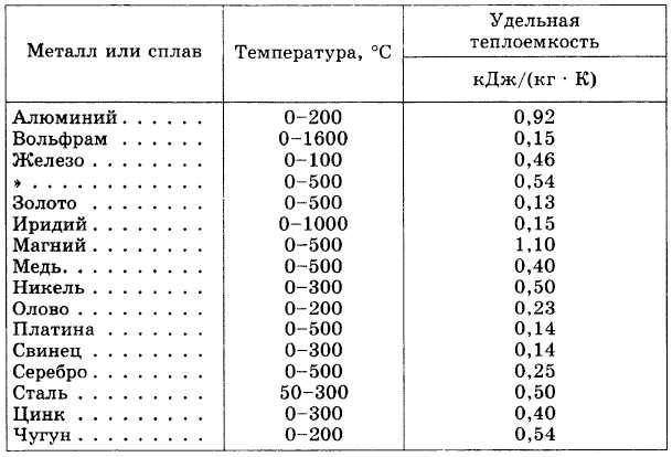 Удельная теплоемкость твердых веществ (t° от О °С до 100 °С)