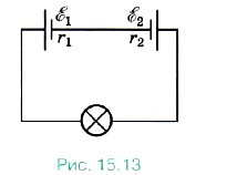 5. Источники тока с ЭДС 4,50 В и 1,50 В и внутренними сопротивлениями 1,50 Ом и 0,50 Ом, соединённые, как показано на рисунке (15.13), питают лампу от карманного фонаря. Какую мощность потребляет лампа, если известно, что сопротивление её нити в нагретом состоянии равно 23 Ом? 6. Замкнутая цепь питается от источника с ЭДС Ε = 6 В и внутренним сопротивлением 0,1 Ом. Постройте графики зависимости силы тока в цепи, напряжения на зажимах источника и мощности от сопротивления внешнего участка. 7. Два элемента, имеющие одинаковые ЭДС по 4,1 В и одинаковые внутренние сопротивления по 4 Ом, соединены одноимёнными полюсами, от которых сделаны выводы, так что получилась батарейка. Какую ЭДС и какое внутреннее сопротивление должен иметь элемент, которым можно было бы заменить такую батарейку?