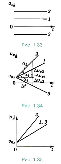 Прямолинейное равноускоренное движение. На рисунке 1.33 изображены графики зависимости проекции ускорения от времени для трёх разных значений ускорения при прямолинейном равноускоренном движении точки. Они представляют собой прямые линии, параллельные оси абсцисс: ах = const. Графики 1 и 2 соответствуют движению, когда вектор ускорения направлен вдоль оси ОХ, график 3 — когда вектор ускорения направлен в противоположную оси ОХ сторону.