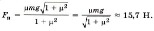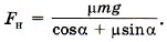 Из уравнения (3) получим N = mg - Fн sinα. Подставив в уравнение (2) выражение для силы трения Fтp = μx(mg - Fн sinα), получим Fн cosα - μx(mg - Fн sinα) = 0. Для силы натяжения имеем Сила натяжения минимальна при максимальном значении суммы cosα + μsinα = ƒ(α). Исследуем функцию на экстремум: ƒ' = -sinα + μcosα = 0. Получим tgα = μ. Тогда Выразим cosa через tgα: Окончательно для силы натяжения получим