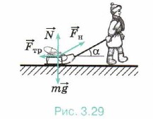 Р е ш е н и е. На санки действуют сила натяжения верёвки m Так как движение по условию равномерное, то ускорение а = 0. Запишем уравнение (1) в проекциях на горизонтальное и вертикальное направления: 0 = Fн cosα - Fтp; (2)