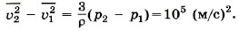 Глава 9. Молекулярно-кинетическая теория идеального газа § 58. Примеры решения задач по теме «Основное уравнение молекулярно-кинетической теории»Обратим внимание на то, что в задачах, как правило, имеется в виду средняя квадратичная скорость поступательного движения молекул. Связь этой скорости с макропараметрами, такими, как давление и температура, и устанавливает основное уравнение молекулярно-кинетической теории. Именно поступательное движение молекул определяет их удары о стенку и силу, действующую на неё. Задача 1. Плотность газа в баллоне электрической лампы ρ = 0,9 кг/м2. При горении лампы давление в ней возросло с р1 = 8 • 104 Па до р2 = 1,1 • 105 Па. На сколько увеличилось при этом значение среднего квадрата скорости молекул газа? Р е ш е н и е. Произведение массы т0 одной молекулы на концентрацию молекул (число молекул в единице объёма) равно массе молекул, заключённых в единице объёма, т. е. плотности газа р = т0п. Следовательно, основное уравнение молекулярно-кинетической теории (9.6) можно записать в виде Поэтому Задача 2. Определите плотность кислорода ρO при давлении 2 • 105 Па, если средний квадрат скорости его молекул равен 106 (м/с)2. Р е ш е н и е. Давление кислорода Окончательно имеем Задача 3. Два одинаковых сосуда, содержащие одинаковое число молекул азота, соединены краном. В первом сосуде средний квадрат скорости молекул Р е ш е н и е. Разные скорости молекул в сосудах объясняются разными температурами азота в них. Так как по условию задачи число молекул, имеющих скорость υ1, равно числу молекул, имеющих скорость υ2 (N1 = N2), то квадрат средней скорости
