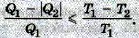 Карно придумал идеальную тепловую машину с идеальным газом в качестве рабочего тела. Идеальная тепловая машина Карно работает по циклу, состоящему из двух изотерм и двух адиабат, причем эти процессы считаются обратимыми (рис. 13.14). Сначала сосуд с газом приводят в контакт с нагревателем, газ изотермически расширяется, совершая положительную работу, при температуре Т1, при этом он получает количество теплоты Q1. Затем сосуд теплоизолируют, газ продолжает расширяться уже адиабатно, при этом его температура понижается до температуры холодильника Т2. После этого газ приводят в контакт с холодильником, при изотермическом сжатии он отдаёт холодильнику количество теплоты Q2, сжимаясь до объёма V4 < V1. Затем сосуд снова теплоизолируют, газ сжимается адиабатно до объёма V1 и возвращается в первоначальное состояние. Для КПД этой машины было получено следующее выражение: