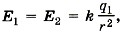 Глава 14. Электростатика § 91. Примеры решения задач по теме «Напряжённость электрического поля. Принцип суперпозиции полей»При решении задач с использованием понятия напряжённости электрического поля нужно прежде всего знать формулы (14.8) и (14.9), определяющие силу, действующую на заряд со стороны электрического поля, и напряжённость поля точечного заряда. Если поле создаётся несколькими зарядами, то для расчёта напряжённости в данной точке надо сделать рисунок и затем определить напряжённость как геометрическую сумму напряжённостей полей. Задача 1. Два одинаковых положительных точечных заряда расположены на расстоянии r друг от друга в вакууме. Определите напряжённость электрического поля в точке, расположенной на одинаковом расстоянии r от этих зарядов.