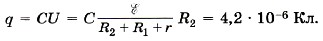 Задача 5. Конденсатор ёмкостью 2 мкФ включён в цепь (рис. 15.12), содержащую три резистора и источник постоянного тока с ЭДС 3,6 В и внутренним сопротивлением 1 Ом. Сопротивления резисторов R1 = 4 Ом, R2 = 7 Ом, R3 = 3 Ом. Чему равен заряд на правой обкладке конденсатора? Р е ш е н и е. Участок цепи, в котором находится конденсатор, разомкнут, и ток через резистор R3 не идёт. Разность потенциалов между пластинами конденсатора равна падению напряжения на резисторе R2: U = IR2. Сила тока, идущего по цепи, согласно закону Ома равна