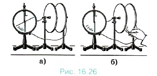 Электрический разряд в газе. Возьмём электрометр с присоединёнными к нему дисками плоского конденсатора и зарядим его (рис. 16.26, а). При комнатной температуре, если воздух достаточно сухой, конденсатор разряжается очень медленно. Это показывает, что электрический ток, вызываемый разностью потенциалов в воздухе между дисками, очень мал. Следовательно, электрическая проводимость воздуха при комнатной температуре мала и воздух можно считать диэлектриком. Теперь нагреем воздух между дисками горящей спичкой (рис. 16.26, б). Заметим, что стрелка электрометра быстро приближается к нулю, значит, конденсатор разряжается. Следовательно, нагретый газ является проводником и в нём устанавливается электрический ток.
