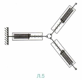1. Укрепите конец одного из динамометров (рис. Л.5). Второй его конец зацепите за кольцо. 2. Зацепите два других динамометра за это же кольцо и тяните таким образом, чтобы два последних динамометра образовывали прямой угол. Когда кольцо станет неподвижным, снимите показания динамометров. 3. Повторите опыт, стараясь расположить динамометры так, чтобы угол между ними был 120°. Снимите показания динамометров. 4. Запишите результаты измерений в таблицу 8.