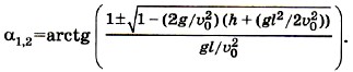 Задача 3. Футболист, находясь от ворот на расстоянии l, ударяет по мячу, и мяч летит с начальной скоростью υ0 и пролетает мимо, едва коснувшись верхней планки ворот. Высота ворот h. Определите, под каким углом начал лететь мяч, после того как футболист ударил по нему. Р е ш е н и е. Выбрав систему координат так, как показано на рисунке 1.56, и начало координат в точке удара по мячу, отметим, что координаты мяча в момент касания верхней планки ворот будут х = l, у = h. Запишем уравнения движения мяча вдоль осей ОХ и OY: х = (υ0cosα)t;