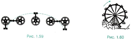 Примерно поступательно движутся ящик письменного стола, поршни двигателя автомобиля относительно цилиндров, вагоны на прямолинейном участке железной дороги, резец токарного станка относительно станины. Движение педали велосипеда или кабины колеса обозрения в парках (рис. 1.59, 1.60) — также примеры поступательного движения.