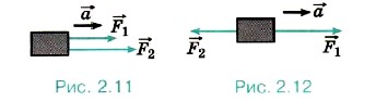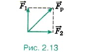 В случае когда силы направлены в противоположные стороны (рис. 2.12), их равнодействующая равна векторной сумме сил p = 1 + 2, но её модуль равен Fp = F1 — F2. Очевидно, что ускорение тела направлено в сторону большей по модулю силы.