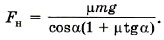 Из уравнения (3) получим N = mg - Fн sinα. Подставив в уравнение (2) выражение для силы трения Fтp = μx(mg - Fн sinα), получим Fн cosα - μx(mg - Fн sinα) = 0. Для силы натяжения имеем Сила натяжения минимальна при максимальном значении суммы cosα + μsinα = ƒ(α). Исследуем функцию на экстремум: ƒ' = -sinα + μcosα = 0. Получим tgα = μ. Тогда Выразим cosa через tgα: Окончательно для силы натяжения получим