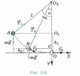 Задача 2. Маятник, представляющий собой маленький шарик, подвешенный на тонкой нити длиной 1 м, отклонили так, что нить стала составлять с вертикалью угол 60°. Затем шарик отпустили. Определите скорость шарика в тот момент, когда угол отклонения нити равен 30° и когда шарик проходит положение равновесия. Р е ш е н и е. На шарик во время движения действуют две силы — сила тяжести и сила натяжения (рис. 5.6). Изменение кинетической энергии шарика при перемещении из точки А в точку В равно: mυ22/2 - 0 = Ат + Ан. (1) Работа силы натяжения равна нулю, так как она всё время перпендикулярна перемещению. На основании закона о независимости движений движение шарика можно рассматривать как сумму двух движений: по оси ОХ и по оси OY. Работа силы тяжести при перемещении шарика вдоль оси ОХ равна нулю, так как сила тяжести перпендикулярна перемещению вдоль этой оси. Работа силы тяжести при перемещении вдоль оси OY равна Ат = mgΔy, где Δу = h1 - h2. Из треугольника АO2O1 получим O1O2 = lcosα0, тогда h1 = l - O1O2 = l(1 - cosα0), а из треугольника ВO2С получим O2С = lcosα, h2 = l - O2С = l(1 - cosα). Окончательно h1 - h2 = l(cosα - cosα0). Работа силы тяжести равна Ат = mgl(cosα - cosα0). Подставив найденное выражение для работы в уравнение (1), получим m22/2 = mgl(cosα - cosα0). Скорость в точке В: Перемещение шарика вдоль оси OY при движении из точки А в точку О равно h1. Тогда скорость шарика в точке О: Задача 3. Тело брошено вертикально вверх со скоростью υ0 = 10 м/с. Определите наибольшую высоту подъёма hmах, а также скорость тела на высоте, равной hmax/2. Силой сопротивления воздуха можно пренебречь. Р е ш е н и е. Изменение кинетической энергии тела при подъёме на максимальную высоту равно работе силы тяжести: 0 - mυ20/2 = -mghmax. Из этого уравнения сразу же получаем выражение для максимальной высоты подъёма: hmах = υ20/2g = 5 м. Скорость тела на некоторой высоте при падении равна его скорости на той же высоте при подъёме. Определим скорость тела при падении с максимальной высоты. Согласно теореме об изменении кинетической энергии mυ2/2 - 0 = mgh = mghmax/2. (Сила тяжести при спуске совершает положительную работу.) Тогда для скорости получаем формулу