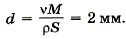 Задача 3. Из блюдца испаряется вода массой 50 г за 4 сут. Определите среднюю скорость испарения — число молекул воды, вылетающих из блюдца за 1 с. Р е ш е н и е. Молекула воды Н2O состоит из двух атомов водорода и одного атома кислорода. Молярная масса воды М = 0,018 кг/моль. Число молекул воды в блюдце Задача 4. Определите толщину серебряного покрытия пластинки площадью 1 см2, если оно содержит серебро в количестве 0,02 моль. Плотность серебра равна 1,05 • 104 кг/м3. Р е ш е н и е. Объём слоя серебра, покрывающего пластинку, V = Sd. Масса серебряного покрытия равна m = ρSd = νM. Молярная масса серебра М = 0,108 кг/моль. Тогда Задачи для самостоятельного решения 1. Какую площадь может занять капля оливкового масла объёмом 0,02 см3 при расплывании её на поверхности воды? 2. Определите молярные массы водорода и гелия. 3. Во сколько раз число атомов в углероде массой 12 кг превышает число молекул в кислороде массой 16 кг? 4. Чему равно количество вещества (в молях), содержащегося в воде массой 1 г? 5. Молярная масса азота равна 0,028 кг/моль. Чему равна масса молекулы азота? 6. Определите число атомов в меди объёмом 1 м3. Молярная масса меди М = 0,0635 кг/моль, её плотность ρ = 9000 кг/м3. 7. Плотность алмаза 3500 кг/м3. Какой объём займут 1022 атомов этого вещества? 8. Определите число атомных слоёв серебряного покрытия толщиной 15 мкм. Плотность серебра 1,05 • 104 кг/м3.