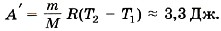 Задача 2. В цилиндре под тяжёлым поршнем находится углекислый газ (М = 0,044 кг/моль) массой m = 0,20 кг. Газ нагревается на ΔТ = 88 К. Какую работу он при этом совершает? Р е ш е н и е. Газ расширяется при некотором постоянном давлении р, которое создаётся атмосферой и поршнем. В этом случае работа газа А' = p(V2 - V1), где V1 и V2 — начальный и конечный объёмы газа. Используя уравнение Менделеева—Клапейрона, выразим произведения pV2 и pV1 через