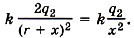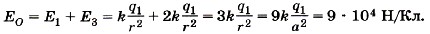 Глава 14. Электростатика § 91. Примеры решения задач по теме «Напряжённость электрического поля. Принцип суперпозиции полей»При решении задач с использованием понятия напряжённости электрического поля нужно прежде всего знать формулы (14.8) и (14.9), определяющие силу, действующую на заряд со стороны электрического поля, и напряжённость поля точечного заряда. Если поле создаётся несколькими зарядами, то для расчёта напряжённости в данной точке надо сделать рисунок и затем определить напряжённость как геометрическую сумму напряжённостей полей. Задача 1. Два одинаковых положительных точечных заряда расположены на расстоянии r друг от друга в вакууме. Определите напряжённость электрического поля в точке, расположенной на одинаковом расстоянии r от этих зарядов.