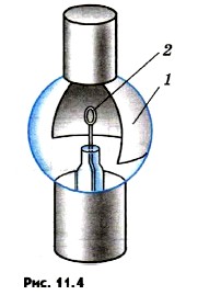 Глава 11. Световые кванты § 90. Применение фотоэффектаОткрытие фотоэффекта имело очень большое значение для более глубокого понимания природы света. Но ценность науки состоит не только в том, что она выясняет сложное и многообразное строение окружающего нас мира, но и в том, что она дает нам в руки средства, используя которые можно совершенствовать производство, улучшать условия материальной и культурной жизни общества. С помощью фотоэффекта «заговорило» кино, стала возможной передача движущихся изображений (телевидение). Применение фотоэлектронных приборов позволило создать станки, которые без участия человека изготовляют детали по заданным чертежам. Основанные на фотоэффекте приборы контролируют размеры изделий лучше человека, вовремя включают и выключают маяки и уличное освещение и т. п. Все это оказалось возможным благодаря изобретению особых устройств — фотоэлементов, в которых энергия света управляет энергией электрического тока или преобразуется в нее. Вакуумные фотоэлементыСовременный вакуумный фотоэлемент представляет собой стеклянную колбу, часть внутренней поверхности которой покрыта тонким слоем металла с малой работой выхода (рис. 11.4). Это катод 1. Через прозрачное окошко свет проникает внутрь колбы.
