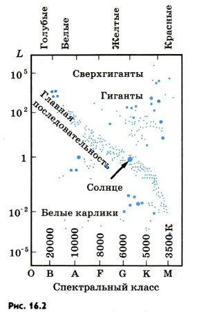 Глава 16. Солнце и звезды § 121. Основные характеристики звездДиаграмма «спектр — светимость»Как и Солнце, звезды освещают Землю, но из-за огромного расстояния до них освещенность, которую они создают на Земле, на много порядков меньше солнечной. По этой причине и возникают технические проблемы при измерениях освещенности от звезд. Астрономы строят гигантские телескопы, чтобы уловить слабые излучения звезд. Чем больше диаметр объектива телескопа, тем более слабые звезды можно с его помощью исследовать. Измерения показали, что, например, Полярная звезда создает освещенность на поверхности Земли Е = 3,8 • 10-9 Вт/м2, что в 370 млрд раз меньше освещенности, создаваемой Солнцем. Расстояние до Полярной звезды составляет 200 пк, или около 650 св. лет (r = б • 1018 м). Поэтому светимость Полярной звезды Lп = 4πr2Е = 4 • 3,14 х (6 • 1018 м)2 • 3,8 • 10-9 Вт/м2 = 9,1 • 1029 Вт = 4600 L Измерения показали, что среди звезд встречаются звезды в сотни тысяч раз более мощные, чем Солнце, и звезды со светимостями в десятки тысяч раз меньшими, чем у Солнца. Измерения температур поверхности звезд показали, что температура поверхности звезды определяет ее видимый цвет и наличие спектральных линий поглощения тех или иных химических элементов в ее спектре. Так, Сириус сияет белым цветом и его температура равна почти 10 000 К. Звезда Бетельгейзе (α Ориона) имеет красный цвет и температуру поверхности около 3500 К. Солнце желтого цвета имеет температуру 6000 К. По температуре, по цвету и виду спектра все звезды разбили на спектральные классы, которые обозначаются буквами О, В, A, F, G, К, М. Спектральная классификация звезд приведена ниже в таблице. Имеется еще одна интересная связь между спектральным классом звезды и ее светимостью, которая представляется в виде диаграммы (рис. 16.2) «спектр — светимость (в светимостях Солнца)» (ее еще называют диаграммой Герцшпрунга—Рессела в честь двух астрономов — Э. Герцшпрунга и Г. Рессела, построивших ее). На диаграмме четко выделяются четыре группы звезд. Главная последовательностьНа нее ложатся параметры большинства звезд. К звездам главной последовательности относится и наше Солнце. Плотности звезд главной последовательности сравнимы с солнечной плотностью.