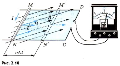 Глава 2. Электромагнитная индукция § 13. ЭДС индукции в движущихся проводникахРассмотрим теперь второй случай возникновения индукционного тока. При движении проводника его свободные заряды движутся вместе с ним. Поэтому на заряды со стороны магнитного поля действует сила Лоренца. Она-то и вызывает перемещение зарядов внутри проводника. ЭДС индукции, следовательно, имеет магнитное происхождение. На многих электростанциях земного шара именно сила Лоренца вызывает перемещение электронов в движущихся проводниках. Вычислим ЭДС индукции, возникающую в проводнике, движущемся в однородном магнитном поле (рис. 2.10). Пусть сторона контура MN длиной I скользит с постоянной скоростью