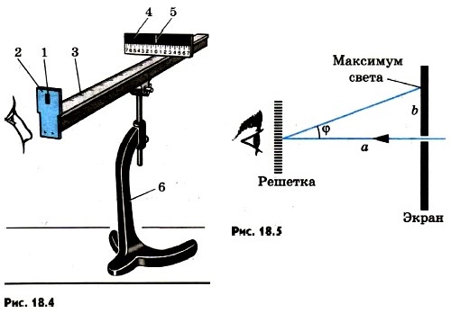 где d — период решетки; k — порядок спектра; φ — угол, под которым наблюдается максимум света соответствующего цвета. Поскольку углы, под которыми наблюдаются максимумы 1-го и 2-го порядков, не превышают 5°, можно вместо синусов углов использовать их тангенсы. Из рисунка 18.5 видно, что