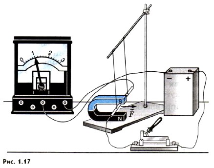 Глава 1. Магнитное поле § 3. Модуль вектора магнитной индукции. Сила АмпераМагнитное поле действует на все участки проводника с током. Зная силу, действующую на каждый малый участок проводника, можно вычислить силу, действующую на весь замкнутый проводник в целом. Закон, определяющий силу, действующую на отдельный небольшой участок проводника (элемент тока), был установлен в 1820 г. А. Ампером 1. Так как создать обособленный элемент тока нельзя, то Ампер проводил опыты с замкнутыми проводниками. Меняя форму проводников и их расположение, он сумел установить выражение для силы, действующей на отдельный элемент тока. 1 Точнее говоря, Ампер установил закон для силы взаимодействия между двумя небольшими участками (элементами) проводников с током. Он был сторонником теории дальнодействия и не пользовался понятием поля. Однако по традиции и в память о заслугах этого ученого выражение для магнитной силы, действующей на проводник с током со стороны магнитного поля, также называют законом Ампера. Модуль вектора магнитной индукцииВыясним экспериментально, от чего зависит сила, действующая на проводник с током в магнитном поле. Это позволит нам дать определение модуля вектора магнитной индукции, а затем найти силу Ампера. Действие магнитного поля на проводник с током будем изучать на установке, изображенной на рисунке 1.17. Свободно подвешенный горизонтально проводник находится в поле постоянного подковообразного магнита. Поле магнита сосредоточено в основном между его полюсами, поэтому магнитная сила действует практически только на часть проводника длиной