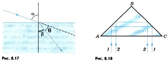 Поэтому угол, на который повернется отраженный луч β = (φ + α) + α - φ = 2α = 34° (см. рис. 8.16). 2. Определите, на какой угол θ отклоняется световой луч от своего первоначального направления при переходе из воздуха в воду, если угол падения а = 75°. Р е ш е н и е. Из рисунка 8.17 видно, что θ = α - β. Согласно закону преломления