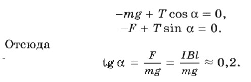 Глава 1. Магнитное поле Примеры решения задач: Магнитное полеРешение задач с применением закона Ампера (и использованием выражения для силы Лоренца) аналогично решению задач механики. Кроме механических сил, надо учитывать силу Ампера (или силу Лоренца) и правильно определять ее направление. 1. Между полюсами магнита подвешен горизонтально на двух невесомых нитях прямой проводник длиной l = 0,2 м и массой m = 10 г. Вектор индукции однородного магнитного поля перпендикулярен проводнику и направлен вертикально; В = 49 мТл. На какой угол α от вертикали отклонятся нити, поддерживающие проводник, если по нему пропустить ток? Сила тока I = 2 А.