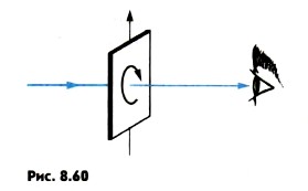 Кристалл турмалина принадлежит к числу так называемых одноосных кристаллов. Возьмем прямоугольную пластину турмалина, вырезанную таким образом, чтобы одна из ее граней была параллельна оси кристалла. Если направить нормально на такую пластину пучок света от электрической лампы или солнца, то вращение пластины вокруг пучка никакого изменения интенсивности света, прошедшего через нее, не вызовет (рис. 8.60). Можно подумать, что свет только частично поглотился в турмалине и приобрел зеленоватую окраску. Больше ничего, кажется, и не произошло. Но это не так. Световая волна проявила новые свои свойства.