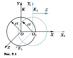 Глава 9. Элементы теории относительности § 76. Постулаты теории относительностиВ основе теории относительности лежат два постулата1. 1 Постулат в физической теории выполняет ту же роль, что и аксиома в математике. Это — основное положение, которое не может быть логически доказано. В физике постулат есть результат обобщения опытных фактов. 1. Все процессы в природе протекают одинаково во всех инерциальных системах отсчета. Это означает, что во всех инерциальных системах отсчета физические законы имеют одинаковую форму. Таким образом, принцип относительности классической механики распространяется на все процессы в природе, в том числе и на электромагнитные. 2. Скорость света в вакууме одинакова во всех инерциальных системах отсчета и не зависит ни от скорости источника, ни от скорости приемника светового сигнала. Скорость света занимает, таким образом, особое положение. Более того, как вытекает из постулатов теории относительности, скорость света в вакууме является максимально возможной скоростью передачи взаимодействий в природе. Для того чтобы сформулировать постулаты теории относительности, нужна была большая научная смелость, так как они противоречили классическим представлениям о пространстве и времени. В самом деле, допустим, что в момент времени, когда начала координат инерциальных систем отсчета К и К1, движущихся относительно друг друга со скоростью