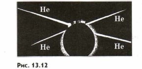 Как видно из фотографии треков в камере Вильсона (рис. 13.12), ядра гелия разлетаются в разные стороны вдоль одной прямой согласно закону сохранения импульса (импульс протона много меньше импульса возникающих α-частиц; на фотографии треки протонов не видны).
