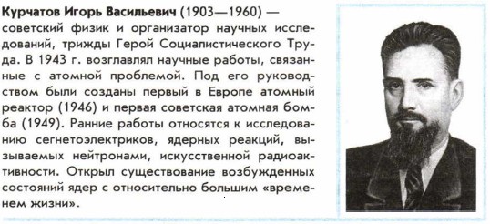Управление реактором осуществляется при помощи стержней, содержащих кадмий или бор. При выдвинутых из активной зоны реактора стержнях k > 1, а при полностью вдвинутых стержнях k < 1. Вдвигая стержни внутрь активной зоны, можно в любой момент времени приостановить развитие цепной реакции. Управление ядерными реакторами осуществляется дистанционно с помощью ЭВМ. Реакторы на быстрых нейтронах. Построены реакторы, работающие без замедлителя на быстрых нейтронах. Так как вероятность деления, вызванного быстрыми нейтронами, мала, то такие реакторы не могут работать на естественном уране. Реакцию можно поддерживать лишь в обогащенной смеси, содержащей не менее 15% изотопа Первые ядерные реакторы. Впервые цепная ядерная реакция деления урана была осуществлена в США коллективом ученых под руководством Энрико Ферми в декабре 1942 г. В нашей стране первый ядерный реактор был запущен 25 декабря 1946 г. коллективом физиков, который возглавлял наш замечательный ученый Игорь Васильевич Курчатов. В настоящее время созданы различные типы реакторов, отличающихся друг от друга как по мощности, так и по своему назначению. В ядерных реакторах, кроме ядерного горючего, имеются замедлитель нейтронов и управляющие стержни. Выделяемая энергия отводится теплоносителем. Вопросы к параграфу 1. Что такое критическая масса? 2. Для чего в атомном реакторе используется замедлитель нейтронов?