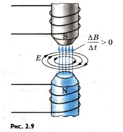 Глава 2. Электромагнитная индукция § 12. Вихревое электрическое полеМагнитный поток Ф = BS cos α. Изменение магнитного потока через контур может происходить: 1) в случае неподвижного проводящего контура, помещенного в изменяющееся во времени поле; 2) в случае проводника, движущегося в магнитном поле, которое может и не меняться со временем. Значение ЭДС индукции в обоих случаях определяется законом (2.4), но происхождение этой ЭДС различно. Рассмотрим сначала первый случай возникновения индукционного тока. Поместим круговой проволочный виток радиусом r в переменное во времени однородное магнитное поле (рис. 2.8). Пусть индукция магнитного поля увеличивается, тогда будет увеличиваться со временем и магнитный поток через поверхность, ограниченную витком. Согласно закону электромагнитной индукции в витке появится индукционный ток. При изменении индукции магнитного поля по линейному закону индукционный ток будет постоянен. Какие же силы заставляют заряды в витке двигаться? Само магнитное поле, пронизывающее катушку, этого сделать не может, так как магнитное поле действует исключительно на движущиеся заряды (этим-то оно и отличается от электрического), а проводник с находящимися в нем электронами неподвижен. Кроме магнитного поля, на заряды, причем как на движущиеся, так и на неподвижные, действует еще электрическое поле. Но ведь те поля, о которых пока шла речь (электростатическое или стационарное), создаются электрическими зарядами, а индукционный ток появляется в результате действия меняющегося магнитного поля. Поэтому можно предположить, что электроны в неподвижном проводнике приводятся в движение электрическим полем и это поле непосредственно порождается меняющимся магнитным полем. Тем самым утверждается новое фундаментальное свойство поля: изменяясь во времени, магнитное поле порождает электрическое поле. К этому выводу впервые пришел Дж. Максвелл.