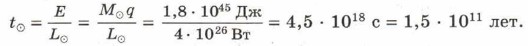 Так, звезда спектрального класса В имеет массу около М ≈ 20М Источник энергии Солнца и звезд. По современным представлениям, источником энергии, поддерживающим излучения Солнца и звезд, служит ядерная энергия, которая выделяется при термоядерных реакциях образования (синтеза) ядер атомов гелия из ядер атомов водорода. При реакции синтеза из четырех ядер атомов водорода (четырех протонов) образуется ядро атома гелия, при этом выделяется энергия ΔЕ = 4,8 • 10-12 Дж, называемая энергией связи, две элементарные частицы нейтрино и два позитрона (4Н Не + 2е+ + 2ν + ΔЕ). Для протекания ядерных реакций необходима температура выше нескольких миллионов кельвинов, при которой участвующие в реакции протоны с одинаковыми зарядами смогли бы получить достаточную энергию для взаимного сближения, преодоления электрических сил отталкивания и слияния в одно новое ядро. В результате термоядерных реакций синтеза из водорода массой 1 кг образуется гелий массой 0,99 кг, дефект масс Δm = 0,01 кг и выделяется энергия q = Δmc2 = 9 • 1014 Дж. Теперь можно оценить, на сколько времени хватит у Солнца запасов водорода, чтобы поддерживать наблюдаемое свечение Солнца, т. е. время жизни Солнца. Запас ядерной энергии Е = M