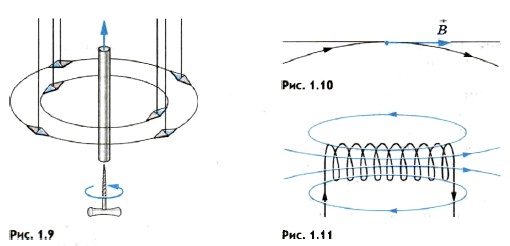 Направление вектора магнитной индукции. Ориентирующее действие магнитного поля на магнитную стрелку или рамку с током можно использовать для определения направления вектора магнитной индукции. За направление вектора магнитной индукци и принимается направление, которое показывает северный полюс N магнитной стрелки, свободно устанавливающейся в магнитном поле (рис. 1.7, а). Это направление совпадает с направлением положительной нормали к замкнутому контуру с током (рис. 1.7, б). Положительная нормаль направлена в ту сторону, куда перемещается буравчик (с правой нарезкой), если вращать его по направлению тока в рамке (рис. 1.7, в). Используя рамку с током или магнитную стрелку, можно определить направление вектора магнитной индукции в любой точке поля. На рисунках 1.8, 1.9 показаны опыты с магнитной стрелкой, повторяющие опыты с рамкой (см. рис. 1.5, 1.6). В магнитном поле прямолинейного проводника с током магнитная стрелка в каждой точке устанавливается по касательной к окружности (см. рис. 1.9). Плоскость такой окружности перпендикулярна проводу, а центр ее лежит на оси провода. Направление вектора магнитной индукции устанавливают с помощью правила буравчика: если направление поступательного движения буравчика совпадает с направлением тока в проводнике, то направление вращения ручки буравчика указывает направление вектора магнитной индукции. Опыт по определению направления вектора индукции магнитного поля Земли проводит каждый, кто ориентируется на местности по компасу.