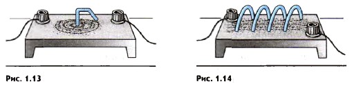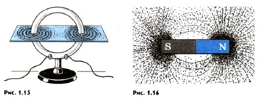 Картину линий магнитной индукции можно сделать видимой, воспользовавшись мелкими железными опилками. С этим методом вы уже знакомы. В магнитном поле каждый кусочек железа, насыпанный на лист картона, намагничивается и ведет себя как маленькая магнитная стрелка. Большое количество таких стрелок позволяет в большем числе точек определить направление магнитного поля и, следовательно, точнее выяснить расположение линий магнитной индукции. Примеры картин магнитного поля приведены на рисунках 1.13—1.16. Вихревое поле. Важная особенность линий магнитной индукции состоит в том, что они не имеют ни начала, ни конца. Они всегда замкнуты. Вспомним, что с электростатическим полем дело обстоит иначе. Его силовые линии во всех случаях имеют источники: они начинаются на положительных зарядах и оканчиваются на отрицательных.