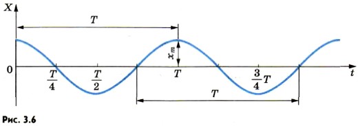 где х" — вторая производная координаты по времени. Согласно уравнению (3.11) при свободных колебаниях координата х изменяется со временем так, что вторая производная координаты по времени прямо пропорциональна самой координате и противоположна ей по знаку. Гармонические колебания. Из курса математики известно, что вторые производные синуса и косинуса по их аргументу пропорциональны самим функциям, взятым с противоположным знаком. В математическом анализе доказывается, что никакие другие функции таким свойством не обладают. Все это позволяет с полным основанием утверждать, что координата тела, совершающего свободные колебания, меняется с течением времени по закону синуса или косинуса. На рисунке 3.6 показано изменение координаты точки со временем по закону косинуса.