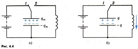 где qm — заряд конденсатора, а С — его электроемкость. Между обкладками конденсатора возникнет разность потенциалов Um. Переведем переключатель в положение 2 (рис. 4.4, б). Конденсатор начнет разряжаться, и в цепи появится электрический ток. Сила тока не сразу достигает максимального значения, а увеличивается постепенно. Это связано с явлением самоиндукции. ЭДС самоиндукции возникает при появлении тока в цепи и препятствует его увеличению, поэтому ток в цепи растет постепенно.