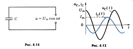 Пусть у нас имеются источники постоянного и переменного напряжений, причем постоянное напряжение на зажимах источника равно действующему значению переменного напряжения. Цепь состоит из конденсатора и лампы накаливания (рис. 4.13), соединенных последовательно. При включении постоянного напряжения (переключатель повернут влево, цепь подключена к точкам АА') лампа не светится. Но при включении переменного напряжения (переключатель повернут вправо, цепь подключена к точкам ВВ') лампа загорается, если емкость конденсатора достаточно велика. Как же переменный ток может идти по цепи, если она фактически разомкнута (между пластинами конденсатора заряды перемещаться не могут)? Все дело в том, что происходит периодическая зарядка и разрядка конденсатора под действием переменного напряжения. Ток, идущий в цепи при перезарядке конденсатора, нагревает нить лампы. Установим, как меняется со временем сила тока в цепи, содержащей только конденсатор, если сопротивлением проводов и обкладок конденсатора можно пренебречь (рис. 4.14). Напряжение на конденсаторе