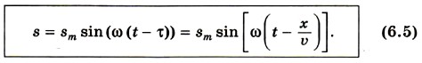 Эта точка также начнет совершать гармонические колебания с частотой ω, но с запаздыванием на время τ (рис. 6.10, б). Если пренебречь затуханием волны по мере ее распространения, то колебания в точке х будут происходить с той же амплитудой sm, но с другой фазой: