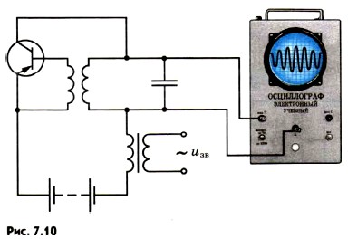 Глава 7. Электромагнитные волны § 53. Модуляция и детектированиеАмплитудная модуляция высокочастотных колебаний достигается специальным воздействием на генератор высокочастотных незатухающих колебаний. В частности, модуляцию можно осуществить, изменяя на колебательном контуре напряжение, создаваемое источником (см. § 36). Чем больше напряжение на контуре генератора, тем больше энергии поступает за период от источника в контур. Это приводит к увеличению амплитуды колебаний в контуре. При уменьшении напряжения энергия, поступающая в контур, также уменьшается. Поэтому уменьшается и амплитуда колебаний в контуре. Если менять напряжение на контуре с частотой, много меньшей частоты колебаний, вырабатываемых генератором, то изменения амплитуды этих колебаний будут приближенно прямо пропорциональны изменениям напряжения. В самом простом устройстве для осуществления амплитудной модуляции включают последовательно с источником постоянного напряжения дополнительный источник переменного напряжения низкой частоты. Этим источником может быть, например, вторичная обмотка трансформатора, если по его первичной обмотке проходит ток звуковой частоты (рис. 7.10). В результате амплитуда колебаний в колебательном контуре генератора будет изменяться в такт с изменениями напряжения на транзисторе. Это и означает, что высокочастотные колебания модулируются по амплитуде низкочастотным сигналом. Временную развертку модулированных колебаний можно непосредственно наблюдать на экране осциллографа, если подать на него напряжение с колебательного контура.