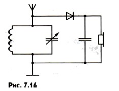 Более сложные фильтры сглаживают небольшие высокочастотные пульсации, и колебания звуковой частоты происходят более плавно, чем это изображено на рисунке 7.15. Простейший радиоприемник. Простейший радиоприемник состоит из колебательного контура, связанного с антенной, и подключенной к нему цепи, состоящей из детектора, конденсатора и телефона (рис. 7.16). В колебательном контуре радиоволной возбуждаются модулированные колебания. Катушки телефонов выполняют роль нагрузки. Через них идет ток звуковой частоты. Небольшие пульсации высокой частоты не сказываются заметно на колебаниях мембраны и не воспринимаются на слух. Модулировать можно амплитуду или частоту колебаний. Проще всего осуществляется амплитудная модуляция. При детектировании переменный ток выпрямляется и высокочастотные пульсации сглаживаются фильтром. Вопросы к параграфу 1. От чего зависит амплитуда автоколебаний в генераторе на транзисторе? 2. Как устроен простейший детекторный радиоприемник?