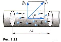 Рассмотрим отрезок тонкого прямого проводника с током (рис. 1.23). Пусть длина отрезка δl и площадь поперечного сечения проводника S настолько малы, что вектор индукции магнитного поля I = qnvS. (1.4) Модуль силы, действующей со стороны магнитного поля на выбранный элемент тока, равен: F = | I | BΔl sin α. Подставляя в эту формулу выражение (1.4) для силы тока, получаем: F = | q | nvS&ΔlB sin α = v| q | NB sin α, где N = nSΔl — число заряженных частиц в рассматриваемом объеме. Следовательно, на каждый движущийся заряд со стороны магнитного поля действует сила Лоренца, равная: