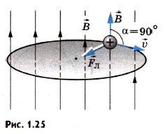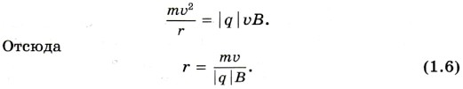Движение заряженной частицы в однородном магнитном поле. Рассмотрим движение частицы с зарядом q в однородном магнитном поле Сила Лоренца зависит от модулей векторов скорости частицы и индукции магнитного поля. Так как магнитное поле не меняет модуль скорости движущейся частицы, то остается неизменным и модуль силы Лоренца. Эта сила перпендикулярна скорости и, следовательно, определяет центростремительное ускорение частицы. Неизменность по модулю центростремительного ускорения частицы, движущейся с постоянной по модулю скоростью, означает, что частица равномерно движется по окружности радиусом r. Определим этот радиус. Согласно второму закону Ньютона (см. рис. 1.25)