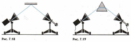 Поглощение электромагнитных волн. Располагают рупоры друг против друга и, добившись хорошей слышимости звука в громкоговорителе, помещают между рупорами различные диэлектрические тела. При этом замечают уменьшение громкости. Отражение электромагнитных волн. Если диэлектрик заменить металлической пластиной, то звук перестанет быть слышимым. Волны не достигают приемника вследствие отражения. Отражение происходит под углом, равным углу падения, как и в случае световых и механических волн. Чтобы убедиться в этом, рупоры располагают под одинаковыми углами к большому металлическому листу (рис. 7.18). Звук исчезнет, если убрать лист или повернуть его.